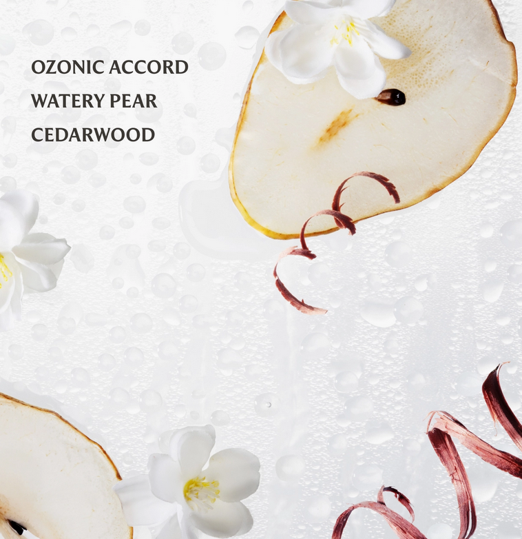 Rainwater Scent: Pure and calming. Watery pear and soft ozonic notes intertwine with cedarwood’s warmth, inspired by the tranquility of fresh rain and open skies.