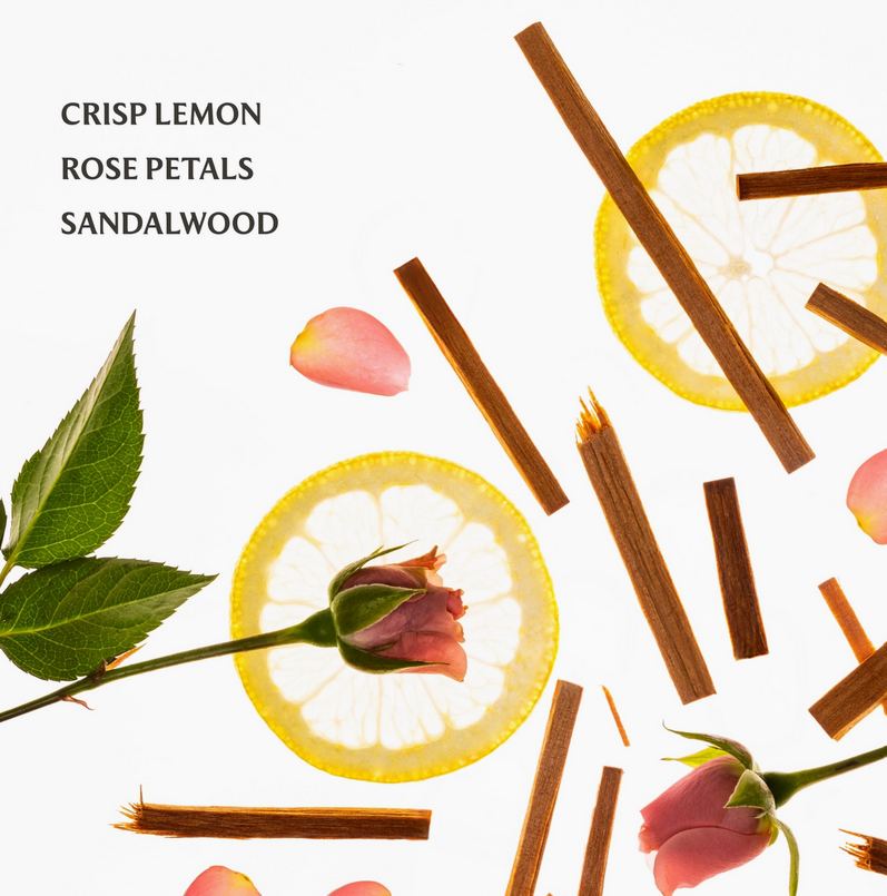 BLUE SANDALWOOD SCENT: Earthy and sophisticated. Smooth sandalwood blends with airy rose petals and a hint of crisp lemon, evoking peace and balance.