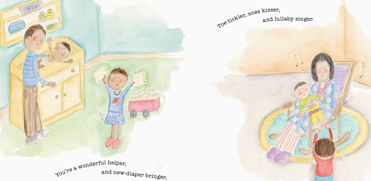A new little one brings lots of changes– some unexpected, some confusing, some exciting – and all a wonderful adventure!  An endearing story,You’re a Big Brother  celebrates all the best parts of a growing family.  With adorable illustrations and heartwarming charm,  You’re a Big Brother overflows with anticipation and joy – the perfect congratulations!