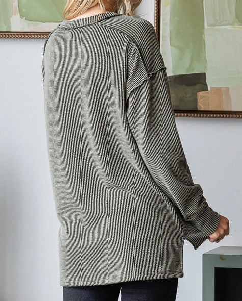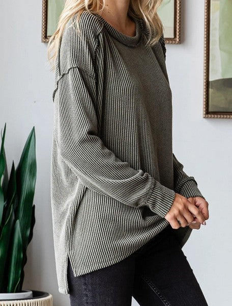 Elevate your everyday wardrobe with this refined ribbed knit top. Crafted with a substantial textured rib fabric, it features a relaxed round neckline, drop shoulders for an effortless silhouette, and long sleeves finished with exposed stitching for contemporary detail. Practical split sides enhance movement and comfort, making this piece equally suited for layering or wearing solo. A versatile essential that bridges casual and polished styling.